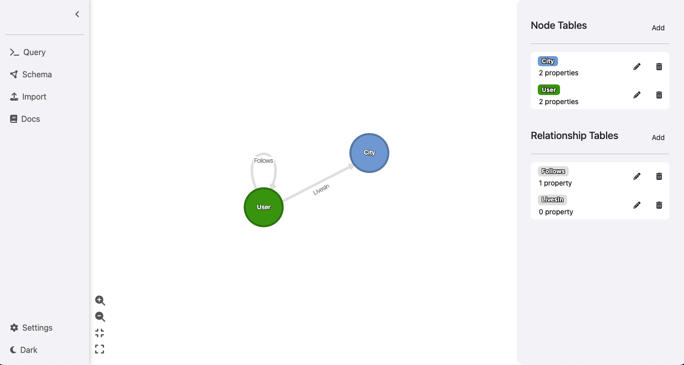City: Table name of citiesUser: Table name of usersFollows: Table name of the follows relationship betweenUserandUsernodesLivesIn: Table name of the lives-in relationship betweenUserandCitynodes